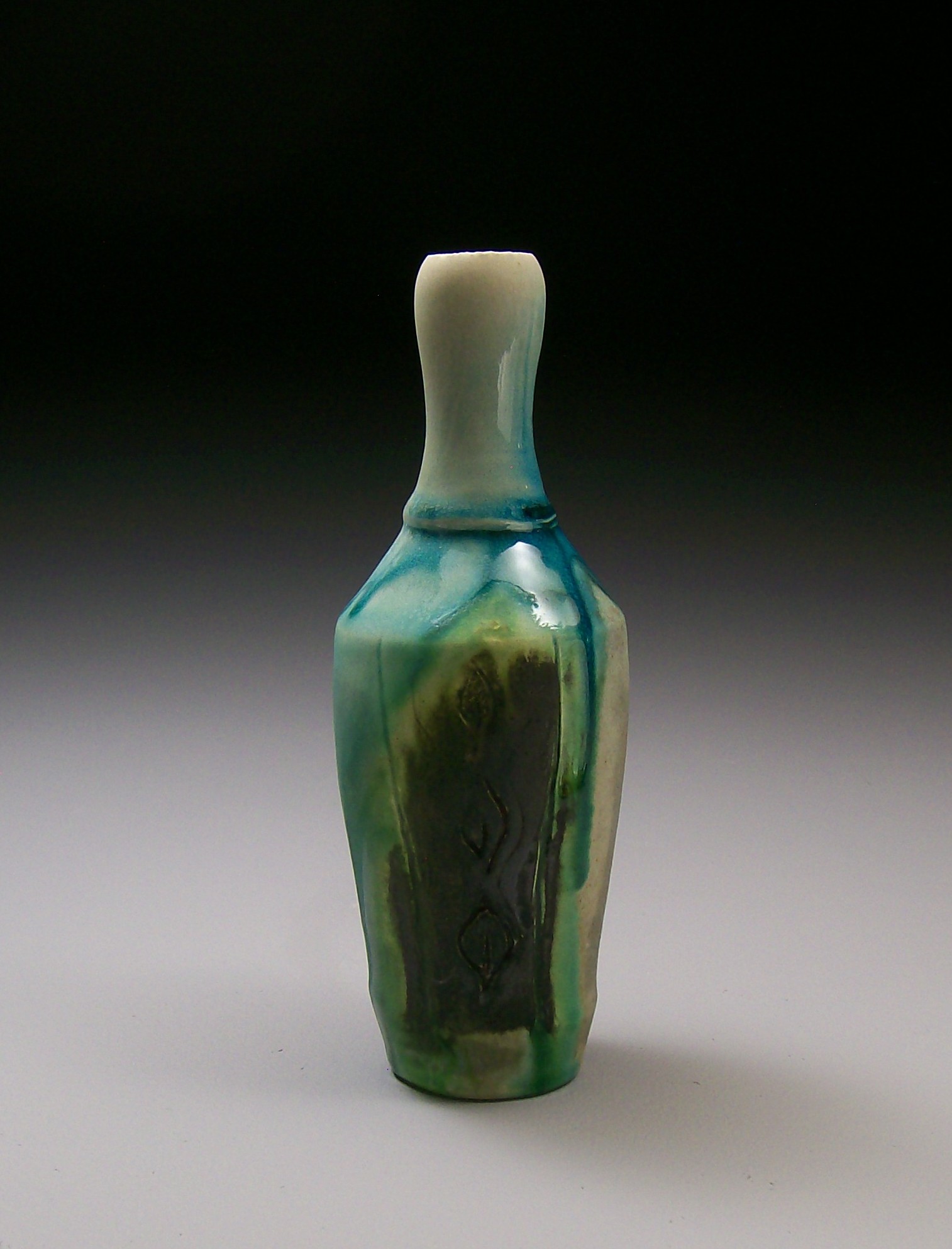 This was a bottle that I soda-fired earlier in the semester– not realizing just how much residual soda there was in the kiln, I figured that a couple more pounds couldn’t hurt… and this is just one of the extreme examples of the runny glazed pots that came out of that firing. I only applied glaze to the neck of this bottle, but it fell down like an aquamarine ice curtain. The black slip I use also reacts strangely with the soda atmosphere– making these caustic neon green dustings on top of the slip. I’m pretty sure it’s not a food-safe reaction, so I think I’ll stick to my salt firings instead 🙂
