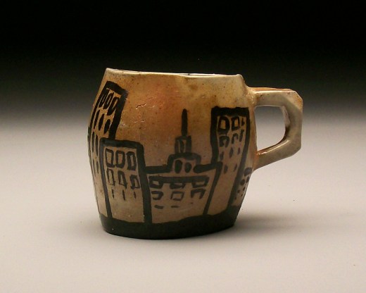 Yeah, that’s right. That sums it up. Pow! (This mug actually does say pow on the other side… don’t know where that photo went) This is a soda fired hand built mug, and I painted the buildings right on the side of the pot, freehand.