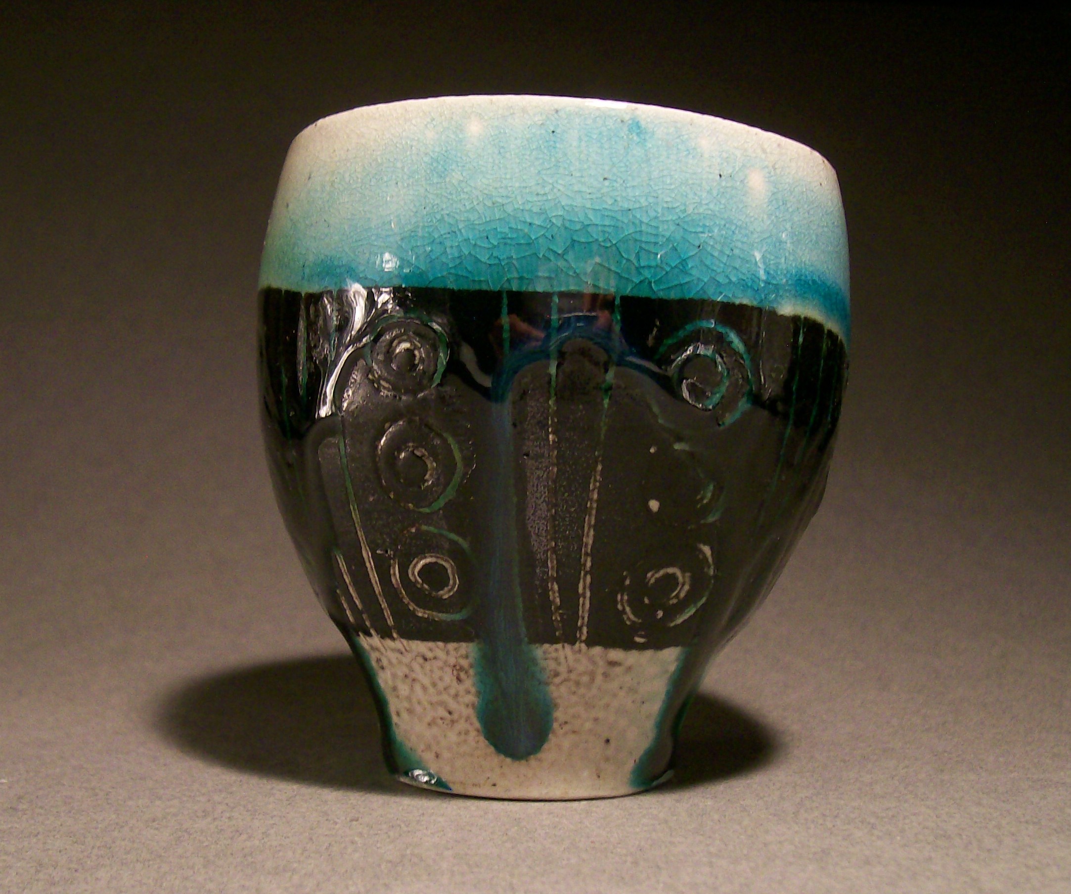 Here’s a melty blue cup that came out of the soda kiln back in about… February? It was cold outside. I remember that much. Anyway, I didn’t realize just how much residual soda was in the kiln… so it was my “executive” decision to add about 1 1/2 pounds 1of soda ash to the atmosphere. I guess if nothing else, it was good practice for introducing soda to the kiln. It wasn’t my first time, but it wasn’t my tenth, either. Anyway, with these cups I thought I had a genius idea. I painted a band of slip on the cup, carved out the design, and dipped the still bare-clay rim into a copper glaze. It might have been genius, if the glaze wasn’t so close to the black slip, and if the kiln wasn’t over-saturated with soda ash. The result was this (above). The thin or non-existent barrier between the glaze and the slip plus the heavy atmosphere created a dramatic eutectic that made the glaze run to the bottom of the pot. There was a lot of heavy grinding in the studio after this firing… my glazes were nothing compared to what filled the rest of the kiln. I didn’t have to grind any shelves, but other people did. This cup was a fun experiment… I have some similar cups that I used a chrome/red iron oxide glaze on that look like green jolly ranchers were melted onto the surface of the pots. I might post them later…