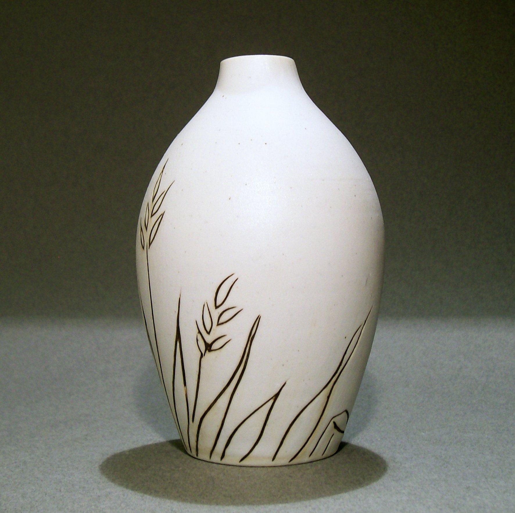 * Grass Bud Vase– grolleg porcelain decorated with incised lines and inlaid mason stain, cone 10 reduction.