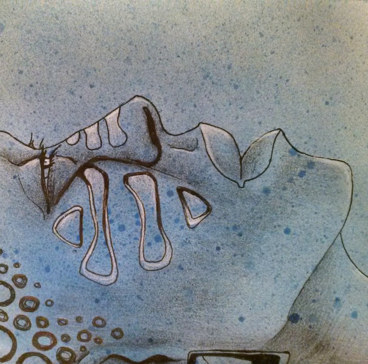 Photo: Tribal Awakening. Sprayed watercolors, ink, colored pencil, and white charcoal on paper. Kira Call, 2013. Just another doodle in my sketchbook… it’s what I was feeling that day. I have been trying to follow my artistic instincts for laying lines down on my surfaces: pots, drawings, painting, and even with jewelry that I make. When I sat down with the blue watercolor surface, I immediately envisioned a horizontal silhouette of a woman’s face. I let it flow from there.