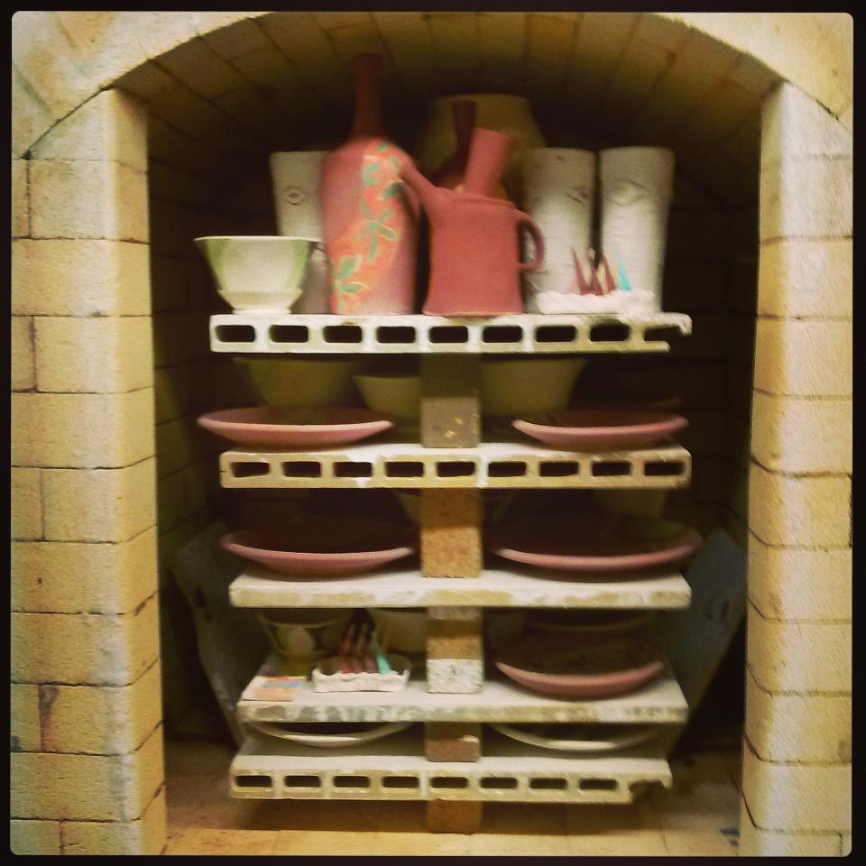 Today was a long day at the studio– I started waxing and glazing work before 5:00pm. I was glazing and loading my kiln until about 10:30pm. It feels good to walk away at the end of the day knowing that I got something done. I will fire the kiln tomorrow– it will take at least 12 hours… but here’s what my kiln looked like before I left the studio tonight: