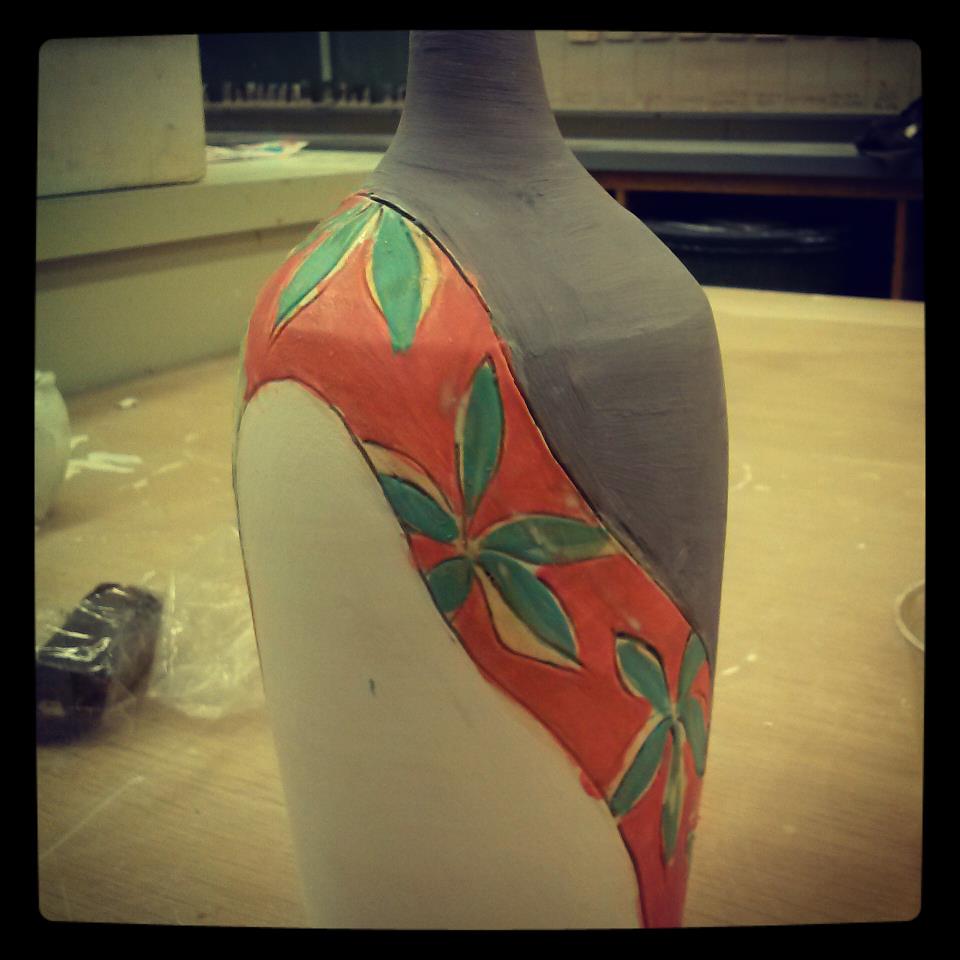 This bottle (above) is in the bisque state– I painted a thin layer of underglaze on it as a test to throw into the big kiln on Friday. Luckily, I did get color at cone 10! But unfortunately I was too caught up in working yesterday to remember to take a photo of the finished bottle… I might just take a quick pic of it along with the mugs later today…