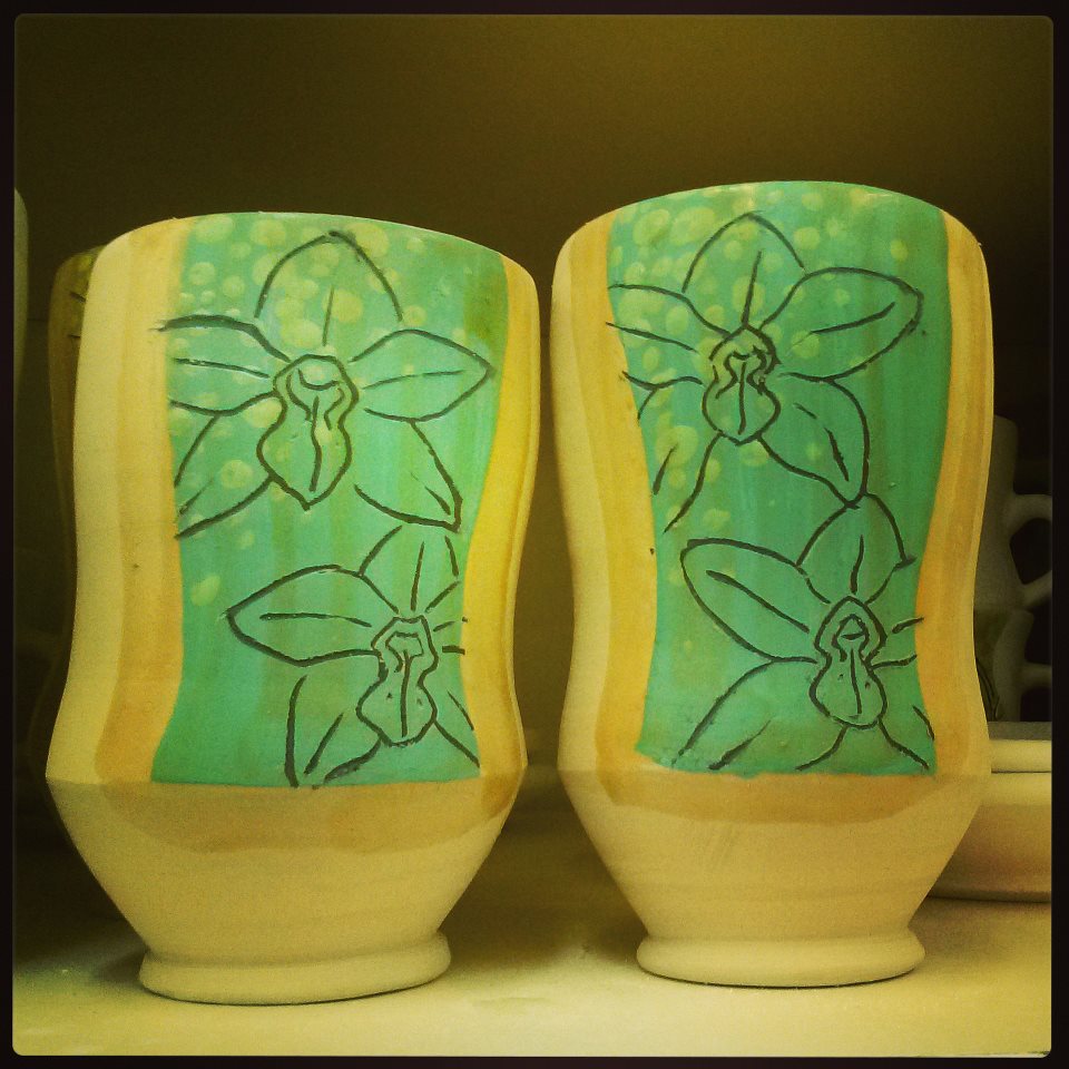 THESE are my newest of new pots… I finished decorating them at around 1:00am last night. I did use a photo reference for the orchids, but obviously I didn’t try to match the drawings exactly to the photo. I just drew the main structuring lines that characterize an orchid šŸ™‚ The blue underglaze goes a bit darker than I thought it would, and the green goes lighter, so we will see how they look when they get finished. I was really excited about the forms of these tumblers– I made a new rib in the tool making class a while ago, but I didn’t plan on this form at the time. Oddly enough, the teardrop-shaped rib made the perfect profile at the bottom of the pot pre-trimming. I like the crisp line I get from trimming to that point, but the rib made it really easy to match the inside of the pot to the outside šŸ™‚