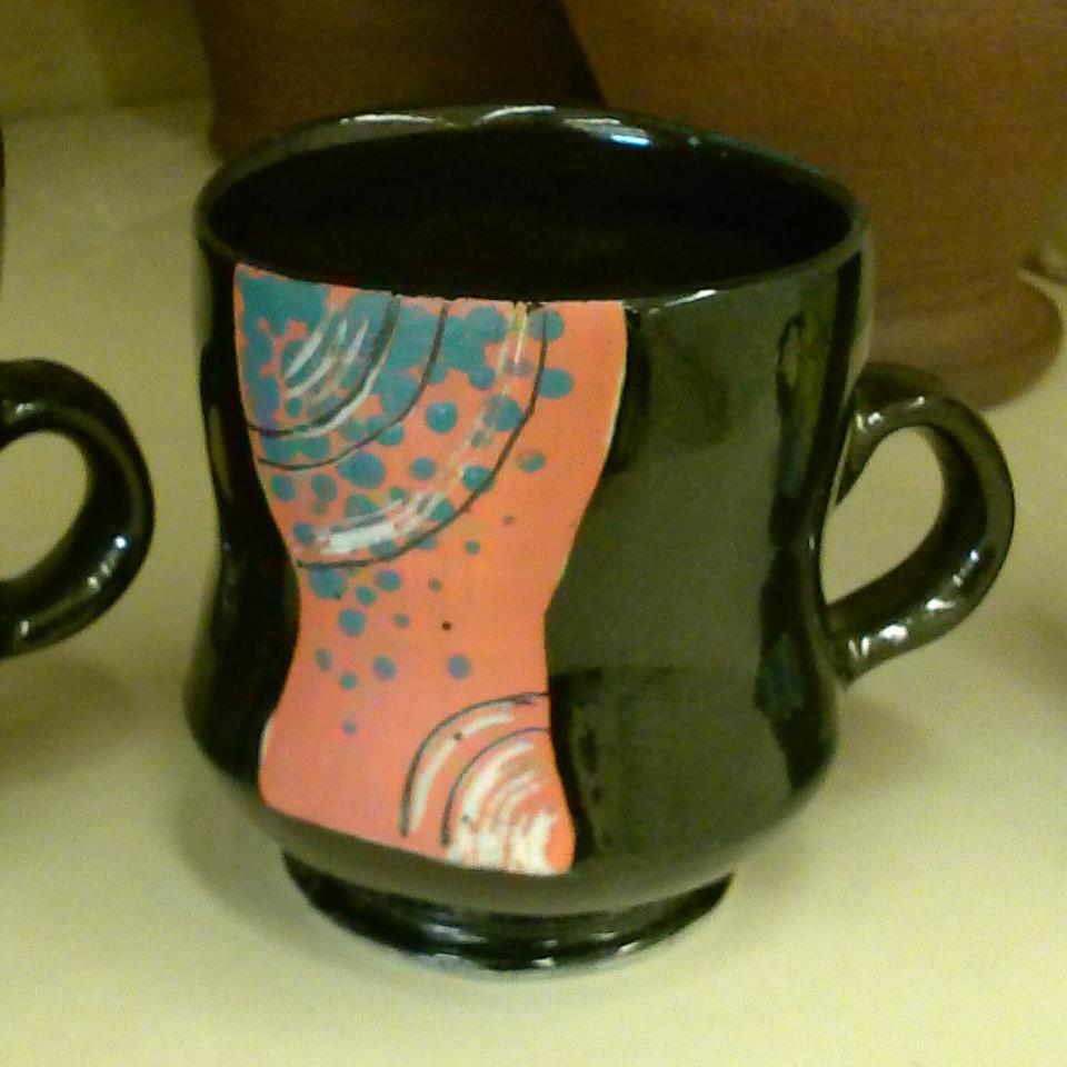 This mug was the most successful piece out of the test firing– the others had bloating issues in the glaze. Apparently I’m working with two very different glazes. My satin matte white glaze that I use doesn’t like to be fired under cone 10, and the black glaze thought it was too hot when I let cone 10 fall down– it wasn’t even a flat 10. Maybe I will work on the satin matte glaze to make it melt at a slightly lower temperature… it’s just a matter of messing with the fluxes and silica.