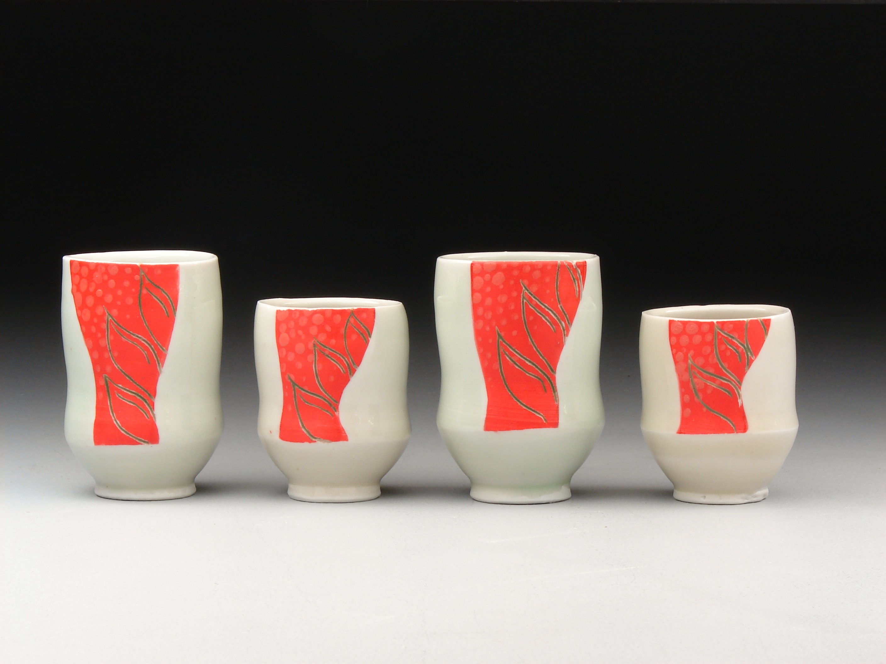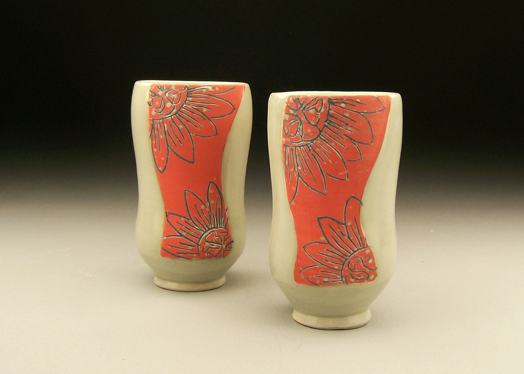 I am seriously so excited about all of my newest pieces! I just took another round of photos from my final firing when the semester ended, and they are bright, happy, and vibrant! I feel like my pots are finally full of life and reflect my own personal expression. It’s the best feeling in the world. I love to draw, I love color, and I LOVE tropical plants. Actually, I love most plants… and they make the most intriguing imagery πŸ™‚ This is the first set of tumblers to have color inlaid inside another color: red inside blue. I decided to add this photo to represent that it was a successful idea, and that it spurred a whole new way of thinking about decorating and drawing for me. Here are more photos!
