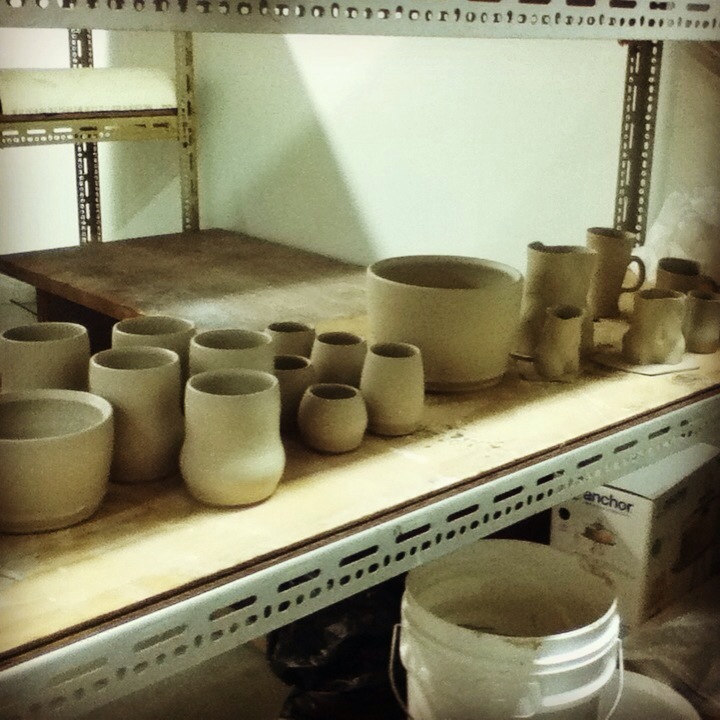 This last photo is just to show how busy my week in the studio has been. I’ve been taking these through the processes of assembling and decorating all week. Things don’t dry out as quickly as I’m used to here, so it slows down my process a bit. Just today, I trimmed 9 mugs, pulled 9 handles, put the handles on, cleaned them up, decorated 5 figure cups, and three other cups that needed decorating. Oh, plus I painted more grevillea flowers on two new soft slab mugs. So I have gotten a bunch done in the 5 hours I was in the studio today. Plus a bit of reclaiming clay work… and periodic cleaning… so it was a productive day 🙂