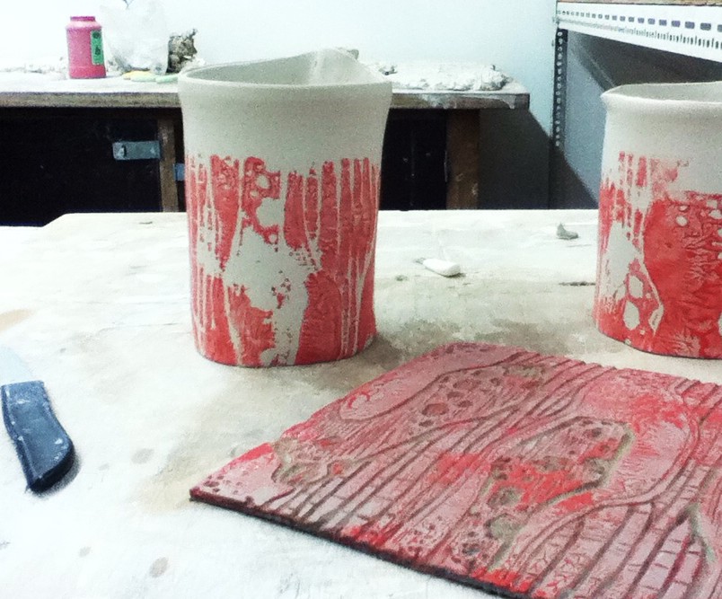 I had a genius idea in the studio the other day. Why not try printing one of my lino blocks– but instead of using ink and paper, why not use underglaze and clay? So I did. And the photo above shows how it went. I haven’t fired them yet, but these mugs will be epic đŸ™‚ I guess my friends probably saw it coming as soon as they knew I was taking a print making class here in Australia. I have other friends who use printing techniques on clay, but I’ve never heard of using a lino block directly on clay with underglaze. I did an embossed cup as well, similar to a blind embossing when testing how a lino block prints using a medium pressure setting on an Enjay press. I didn’t put a handle on that cup because it seemed a little too narrow for a mug. Anyway, I plan on just using a clear glaze over top of the underglaze as is custom. The firing temperature is up in the air at this point… I was told today that I am restricted to cone 6, which means I will have to reformulate glaze recipes before mixing. I’m not too happy about the idea of firing at cone 6. It seems like such an illogical temperature. Ceramic art isn’t eco-friendly– that’s just how it is. By skimping a few degrees, it just hurts the possibilities you could achieve at a higher temperature, and I doubt it makes too much of a difference for the ozone layer… yes, it does cost a bit more to reach that temperature, but it’s definitely worth it in the long run. The best comparison I can think of at the moment is when people buy skim milk instead of whole milk. If it’s a taste thing, fine. But if it’s because you think it’s healthier to cut out some of the milk’s natural fat and that you will lose a few pounds because you drink skim milk, that’s ridiculous. Whole milk tastes so much better, and if it’s whole, it’s closer to how it naturally occurs, which means it should be better for you, right? At least it tastes better and if you are drinking enough milk to gain weight from it, that’s just weird. So that’s my point. The fat, the temperature, sometimes you need to go all the way with things for them to be at their fullest potential. So I like to fire at cone 10 in a gas kiln with a satin matte glaze that I formulated myself– the crystal growth is so beautiful. Subtle, small crystals coating the surface like when the window of a car is lightly frosted, just past the freezing point by a few degrees. A beautifully smooth but buttery satin surface. The temperature and the density of the clay makes all the difference. I will figure out how to make my work decent and appealing here, but I can’t wait to be able to fire at cone 10 in a gas kiln again. On my own. I miss firing. I am going through a withdrawal.