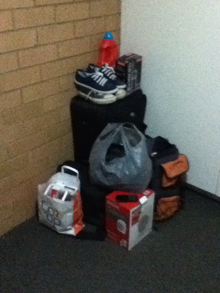 All of my material possessions fit in this pile. The only things missing are my laptop computer, my iPod, and my sheet set. The dunie cover here isn’t even my own– it was given to me along with a pillow when I got here. I guess I have some food and wine that’s not pictured, but that’s a different category. It would all fit in two or three plastic grocery bags as well. I guess moving out tomorrow will be really easy.