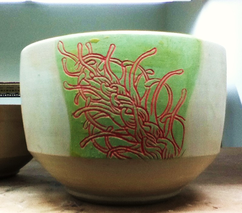 Photo: greenware work in progress, a big serving bowl with an Australian Grevillea flower inlaid in red underglaze.