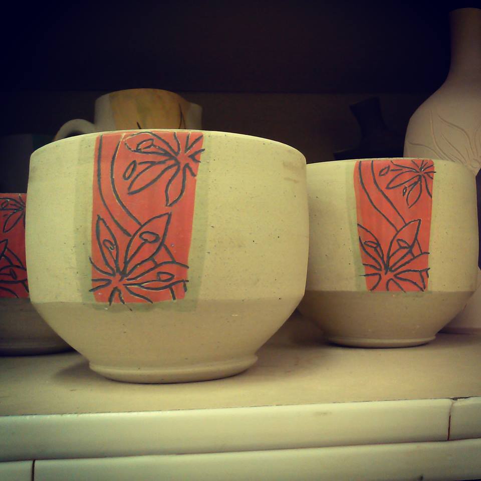 Also, the red-orange underglaze that I’ve been making by mixing red and orange AMACO underglazes together seems to be the best hue of red that suits my work. The red on its own is way too stop sign, and the orange reads like construction 😛 so mixing the two together became the perfect balance. As far as my underglazes go, they are sort of evolving into engobes. I’ve been adding a bit of gerstley borate in liquid deflocculated form to each color that seems too dry post-firing. I would rather have a semi-gloss surface, but only slightly. I made a teapot in Auz that captured the perfect surface I am going for. It had a smooth but crystal-ly iridescence to it that I probably won’t be able to recreate. I did bring the teapot home with me. I’m just trying to figure out how much gerstley borate I have to add in order to get that balance again. It also depends on firing temp.