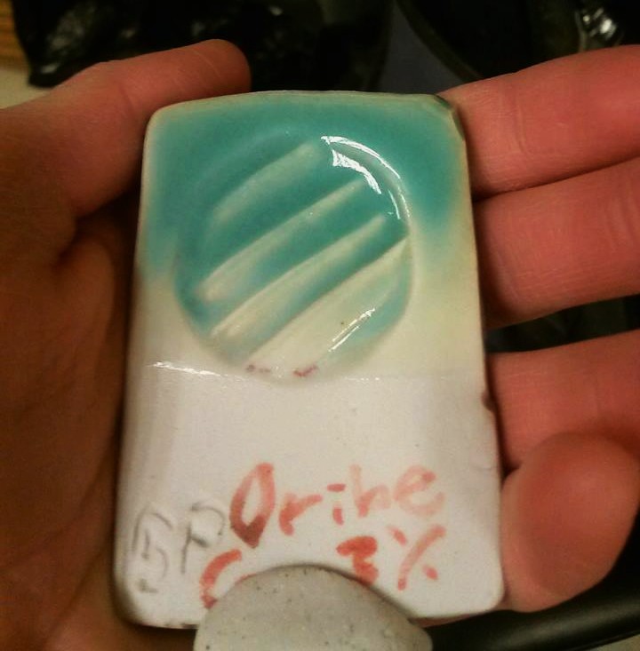 Alright, as promised– a photo of my glaze testing. Yeah, I have more tiles, but this is the one that I was most excited about. This was the result I was hoping for (or at least similar blue colors) with all but three of the 10+ test tiles in the kiln. I fired to a hot cone 10. This is the “Turquoise Oribe” glaze from the John Britt High Fire GLazes book with the copper reduced to 3% instead of 6.7, so it’s not nearly as saturated and won’t tend to go liver pink as easily. The problem with this beautiful glaze result is that I didn’t come up with the glaze myself. I did create a limestone glaze with the satiny surface that I’m more drawn to, and I tested varying amounts of copper and copper/tin blends in it, all of which turned light green. It makes an appealing green glaze, but I am trying to get blue. Guess I need to figure out how to diversify my fluxes and reduce the clay content a little bit… I see a quadraxial blend grid tile in my near future 😛 For now, I am very happy with this result and am doing a vinegar leach test, after which I will glaze a few pots with it if it doesn’t leach copper.