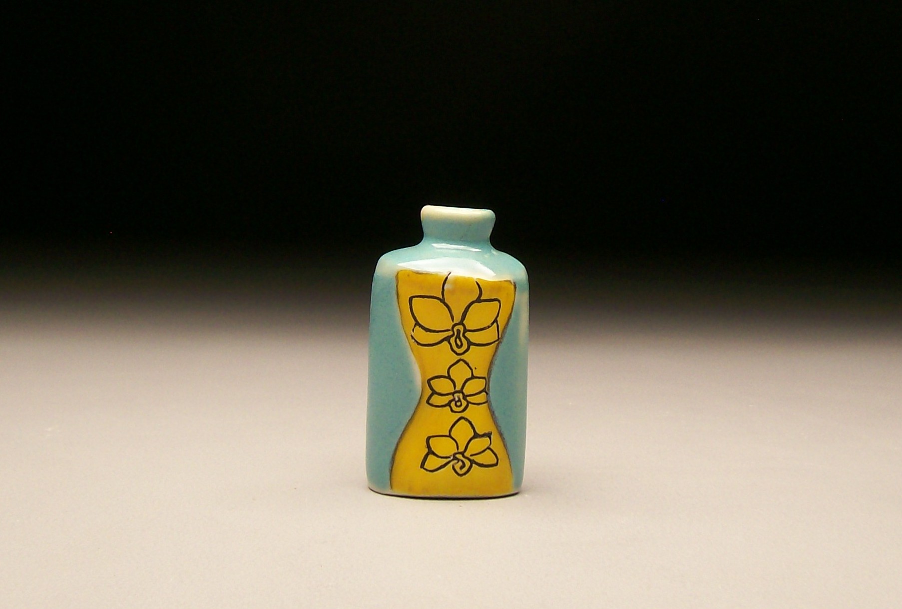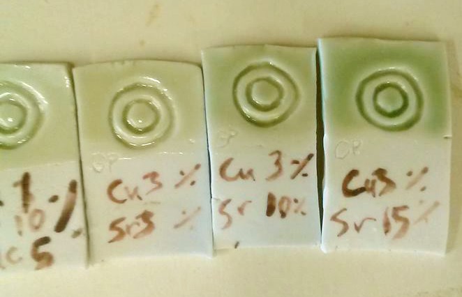 This bottle has the turquoise oribe glaze applied and fired in oxidation at cone ten– with just 3% copper instead of nearly 7%. I will definitely keep using this glaze for a while, but I really want to come up with my own copper blue recipe. The second and third photo of tiles that turned green are my tests. The strontium addition of 15% made an attractive green glaze that I might be able to use, but it’s still not copper blue. I unloaded a test kiln just this morning with similar green results. Guess I’ll just have to keep testing. Wonder if I will get blue by the end of the semester…