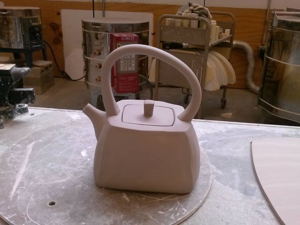 Alright, I know this page has been sitting quietly for while now. That’s because I’ve been hunkering down in the studio making teapots and other cool new stuff like crazy. I had a whole kiln load of teapots that destroyed themselves (luckily it was a small kiln, and the casualties measured six teapots dead). Making six teapots is still a lot of work to just throw away after the firing. I have a teapot graveyard on my top shelf in the studio. They all split their sides and/or the handle detached and slumped. I’ve had much better luck since I’ve started working with a lighter colored stoneware clay (the teapot above is what the new clay body looks like before it dries out).